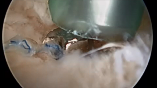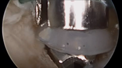 ZipE® technology for double row rotator cuff repair is shown below in a cadvaer model illustrating how the suture capture can be placed on the bone side after shuttling the suture through the screw. |